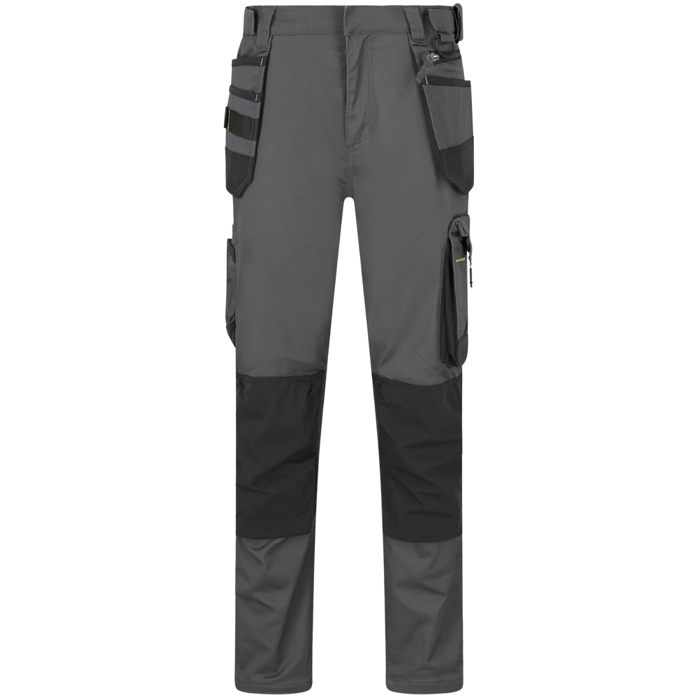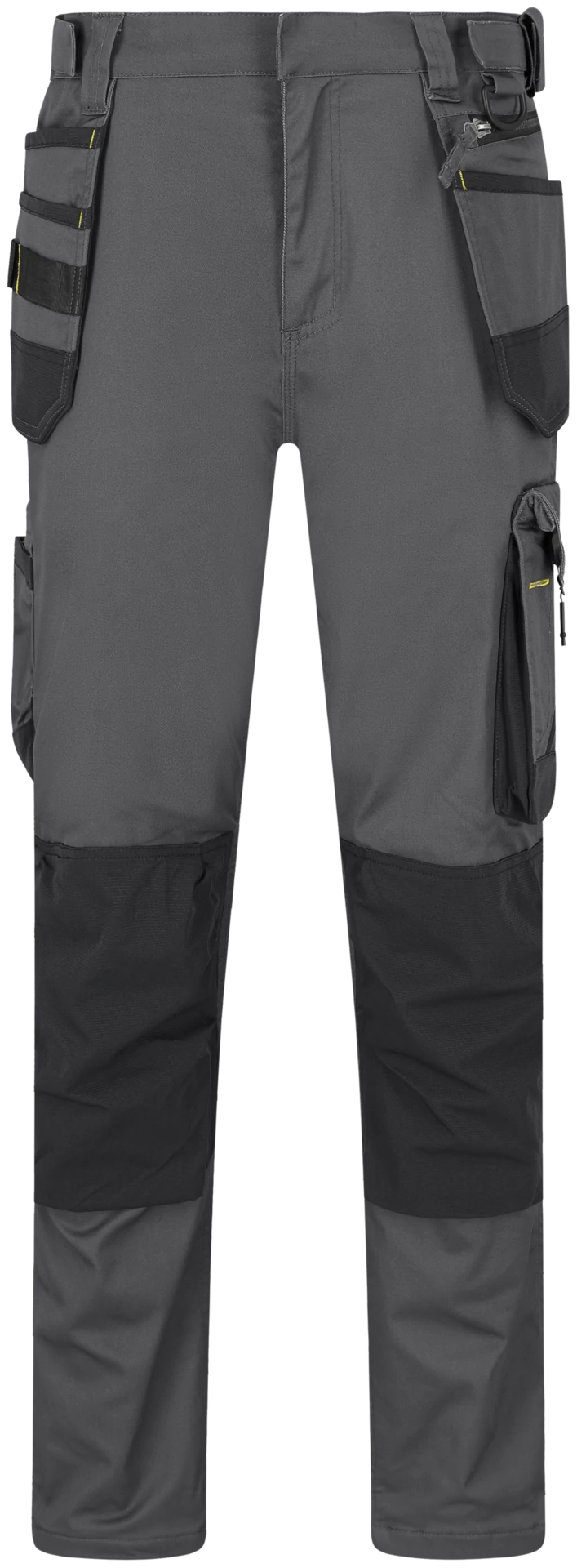 A nadrág megerősített térdzsebekkel rendelkezik, amelyek hosszabb élettartamot biztosítanak még intenzív használat esetén is, valamint fix holster‑zsebek, oldalsó multifunkciós zsebek, kalapácsfogó és D‑gyűrű segítik a szerszámok, mérőeszközök és azonosítók könnyű és biztonságos tárolását. Az elasztikus derékrész és az oldalsó tépőzáras állítás egyedi, komfortos illeszkedést biztosít, még változó testhelyzetek vagy hosszabb munkanapok esetén is.