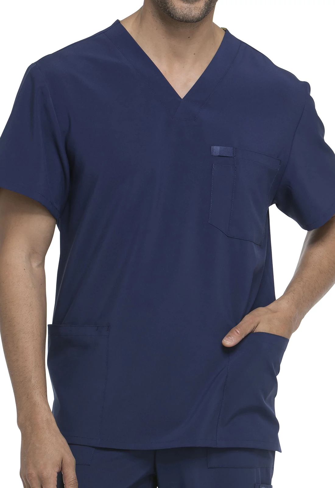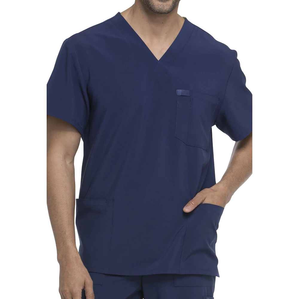 Férfi szabású felső négy zsebbel; két foltzsebbel, egy ollós zsebbel és egy tolltartós mellzsebbel. Ezenkívül jellegzetes tónusú szőtt címke, vászonszalag és egy jellegzetes logós vászonszalag található a nyaknál. Háthossz középen: 74 cm.