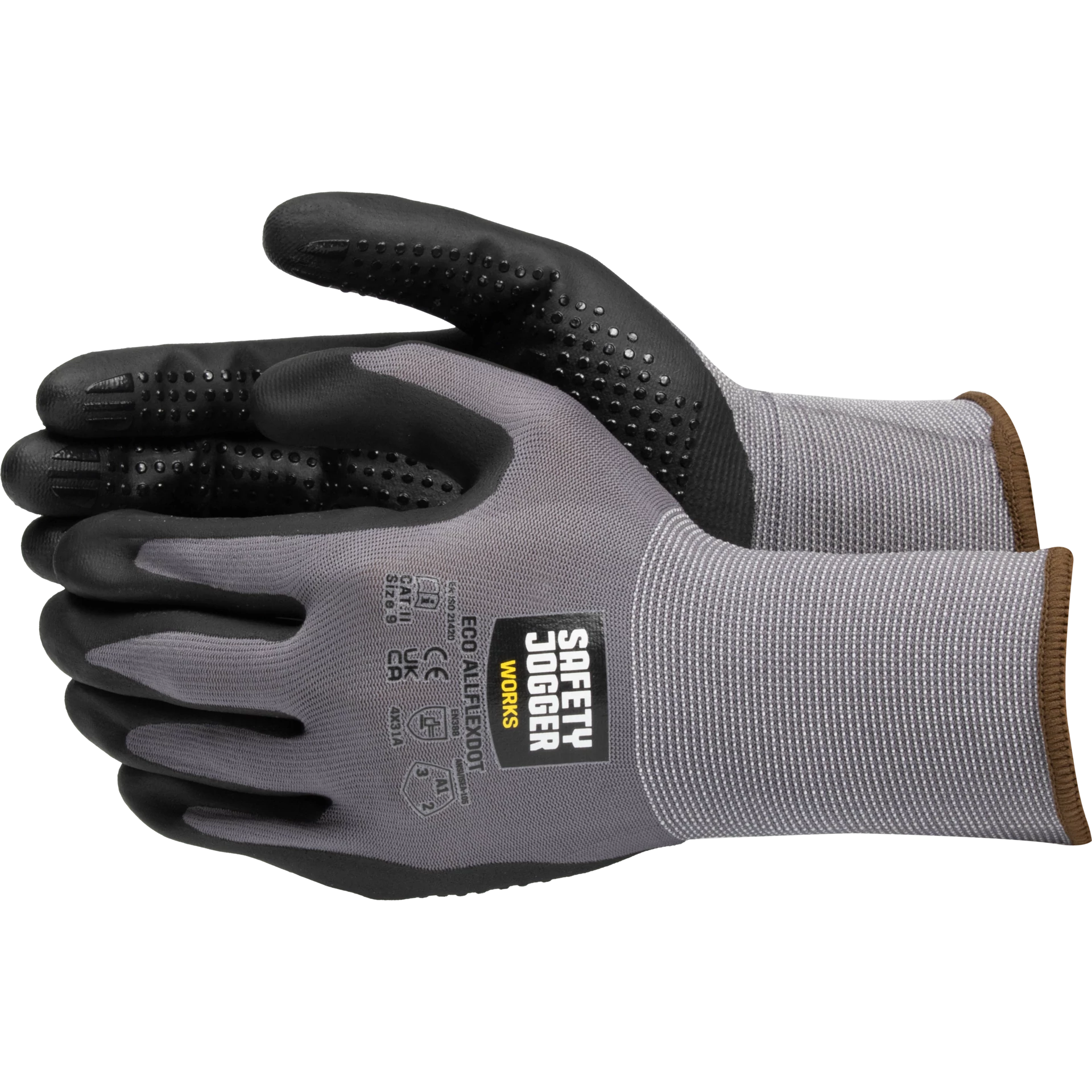 A Safety Jogger EcoFlexDot egy varrás nélküli, sokoldalú védőkesztyű, amelyet kifejezetten könnyű, finom és precíz munkafolyamatokhoz terveztek. A reciklált nylon bélés és a nitril hab- és pontbevonat kombinációja lehetővé teszi a kiváló fogást és kontrollt még száraz körülmények között is, miközben a kesztyű magas kopásállósággal rendelkezik az EN 388:2016 4 X 3 1 A szabvány szerint.